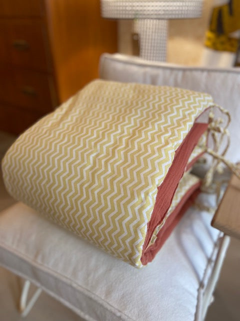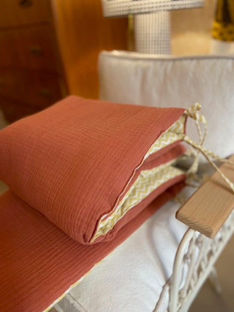 Réversible : un côté double gaze terracotta et un autre côté en coton à motifs chevrons couleur citron certifiés OEKO TEX.